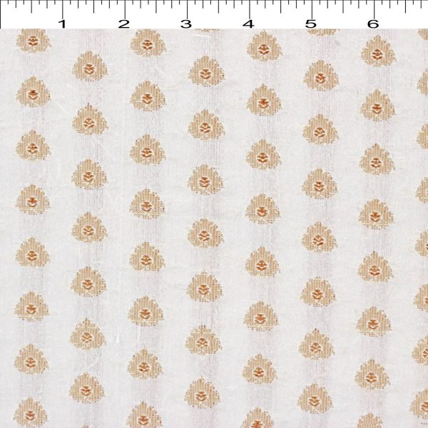 What goes more beautiful than a free hand small butti motif design  running across Dyeable Light Copper Gold Metallic Brocade Jaquard Fabric ? The Free hand fashion geometry  can make or break the monotonous pattern design…. The Jacquard creates freshness in the apparels or home decor..  To add charm and break homogeneity in the home decor or upholstery, use it to tuck the cushions or a drape.  Break the singularity of pattern and create a lovely contrast  by using in the Garments like Women Kurti’s or Jackets or Bold Chic’s ankle length pants or Saree Borders, or Men’s Shirt, Indian Traditionals like Sherwani, Kurta, etc…Â