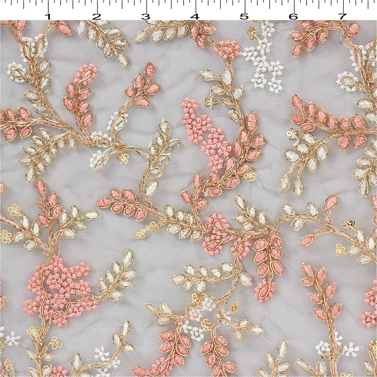 DYEABLE WHITE NET FABRIC WTH GOLD CODEING THREAD WORK IN FLORAL PAISELY PRINT.